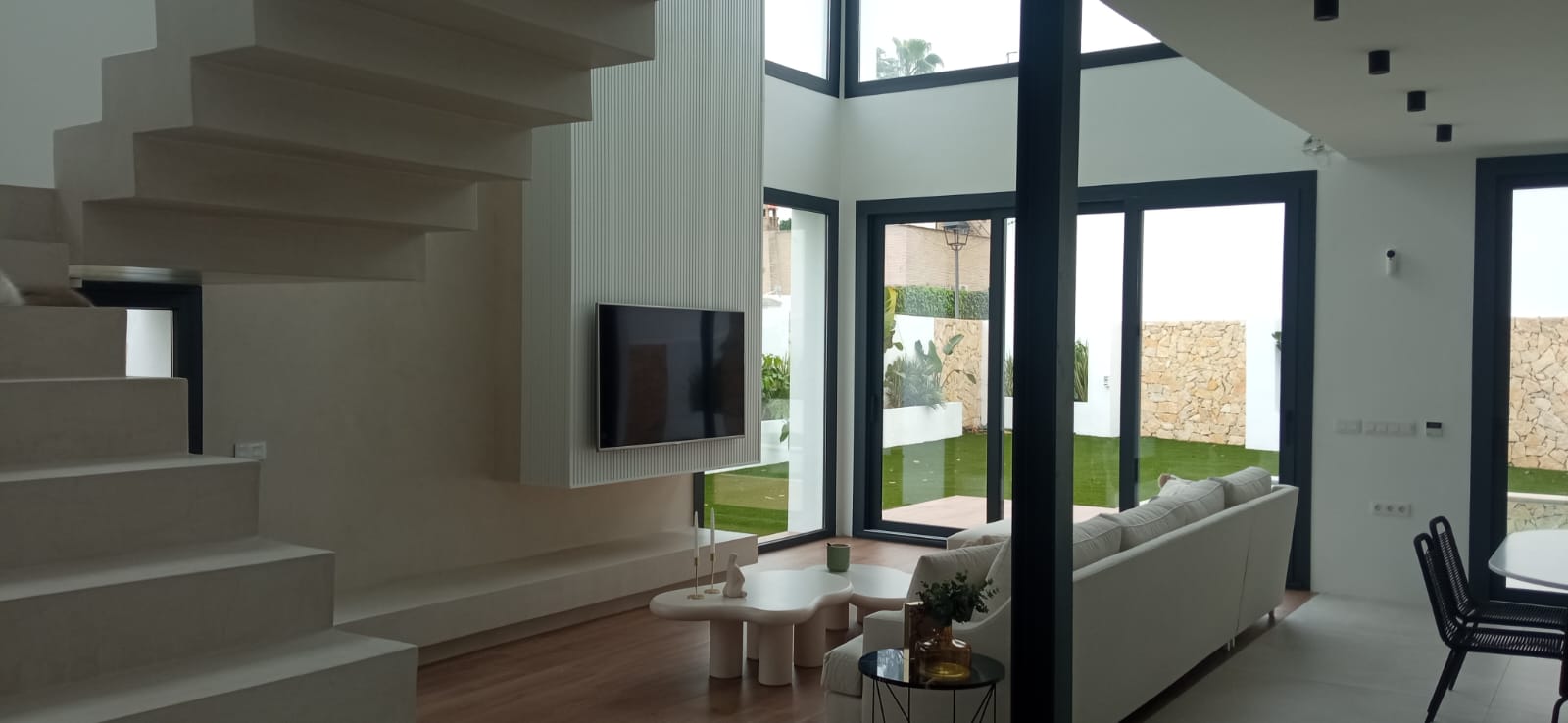 El programa solicitado incluyó una planta baja con salón comedor a doble altura, con una escalera escultural para comunicar con los dormitorios en planta primera.